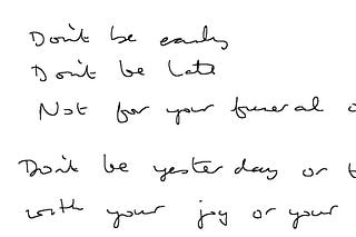 Don't be early, don't be late, not for your funeral or for a date. Not for yesterday or tomorrow, with your joy or your sorrow. Or hesitate and before…